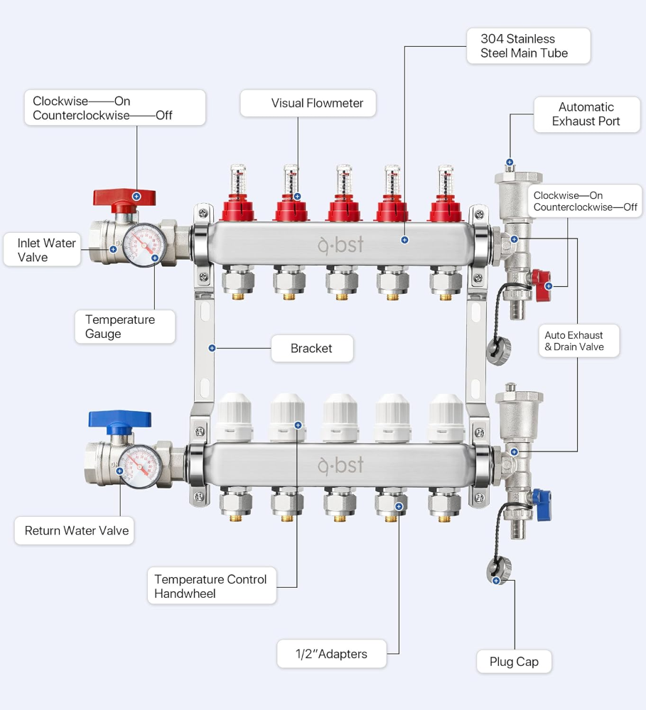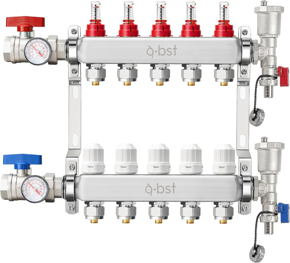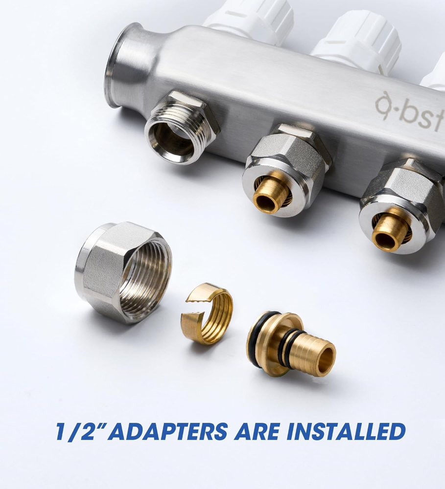 ABST PEX – Colector de calor de acero inoxidable de 5 ramas con adaptadores de 1/2 pulgada incluidos para calefacción radiante hidrónico