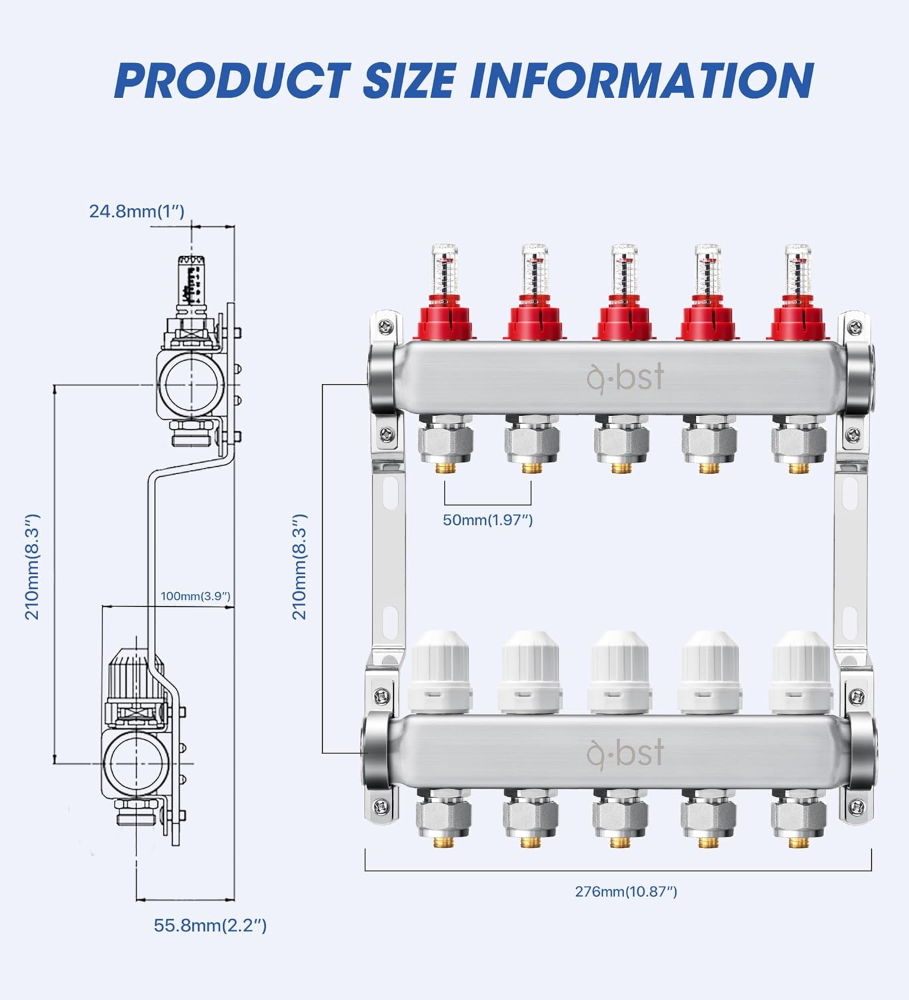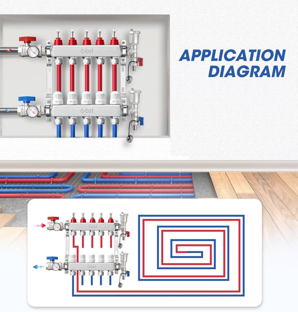 Fabricado en acero inoxidable de alta resistencia, ofrece excelente durabilidad y protección contra la corrosión, lo que lo hace adecuado para uso prolongado en instalaciones residenciales y comerciales. Incluye adaptadores de 1/2 pulgada, lo que simplifica la instalación y asegura compatibilidad con sistemas estándar de calefacción radiante.