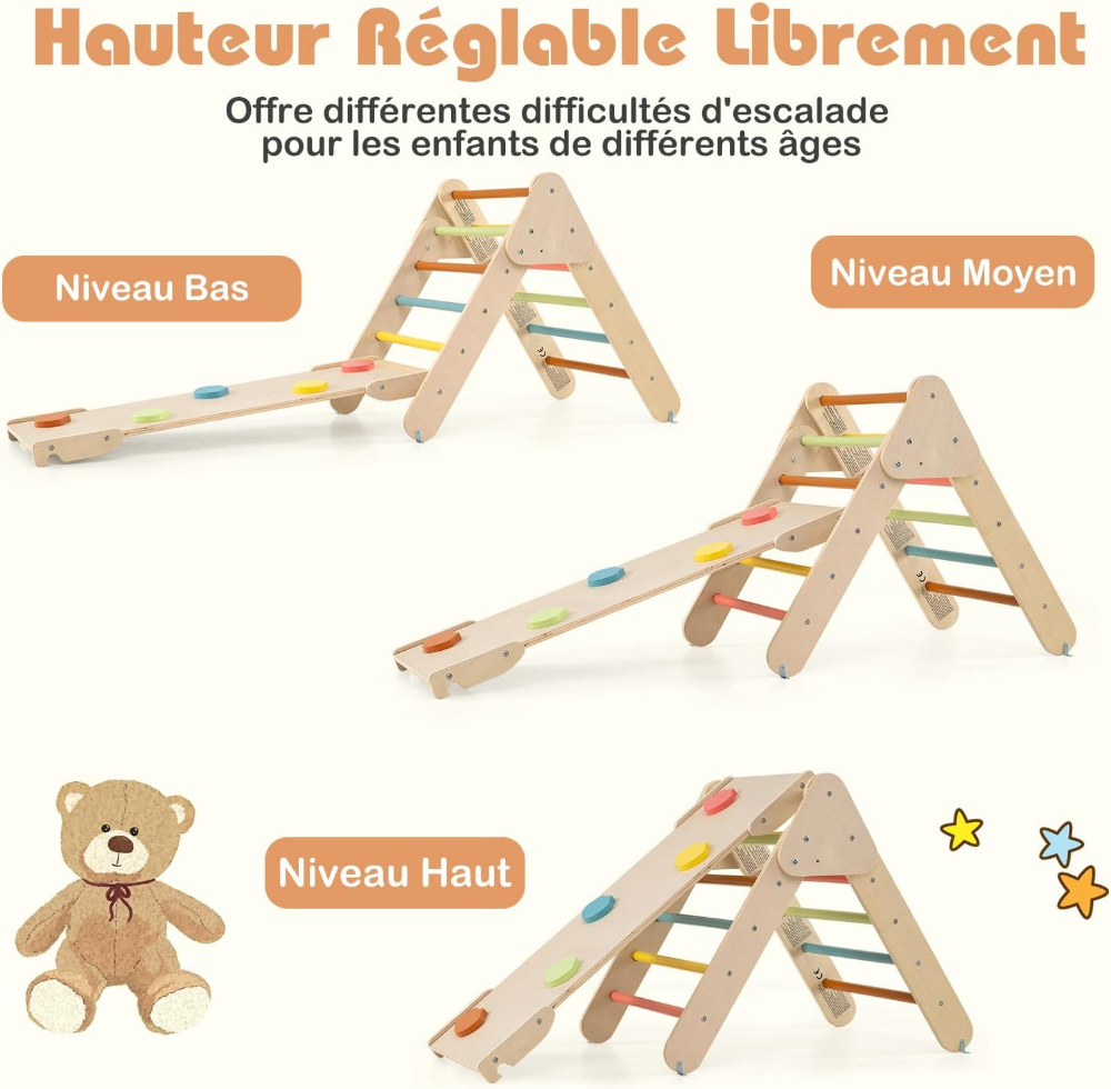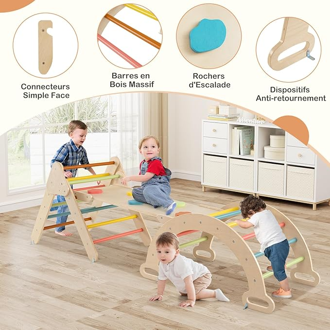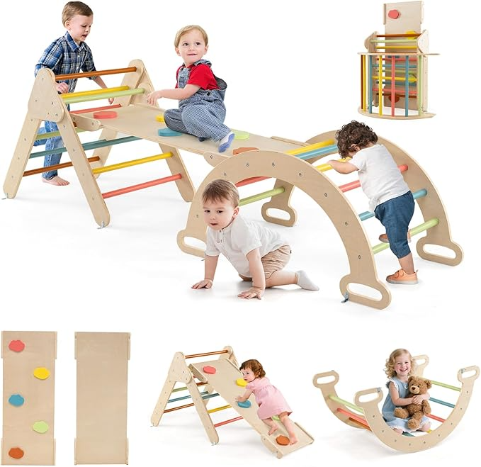 Arco triangular Montessori 7 en 1, arco de escalada infantil con tobogán de madera, rampa, escalera ajustable, soporta hasta 50 kg, para niños pequeños de 1 año en adelante, 7 en 1, colores.