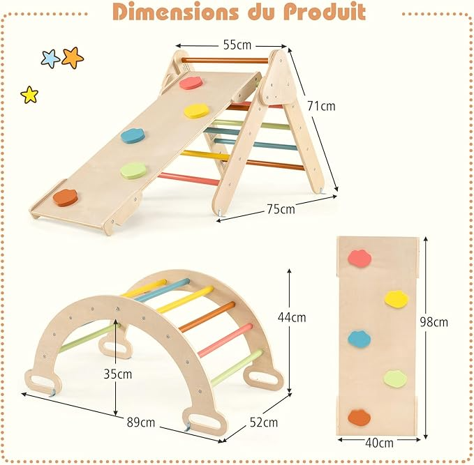 GOPLUS UT21278NLFR es un juego Montessori 7 en 1 para niños desde 1 año, diseñado para estimular el movimiento, equilibrio y coordinación de forma segura en interiores. Incluye triángulo de escalada, arco y tabla reversible que funciona como rampa o deslizadero, además de escalera ajustable para variar la dificultad. Está fabricado en madera de haya, con esquinas redondeadas y superficie lisa para mayor seguridad. Cada pieza soporta hasta 50 kg, ofreciendo estabilidad, resistencia y un espacio de juego activo y versátil en casa.