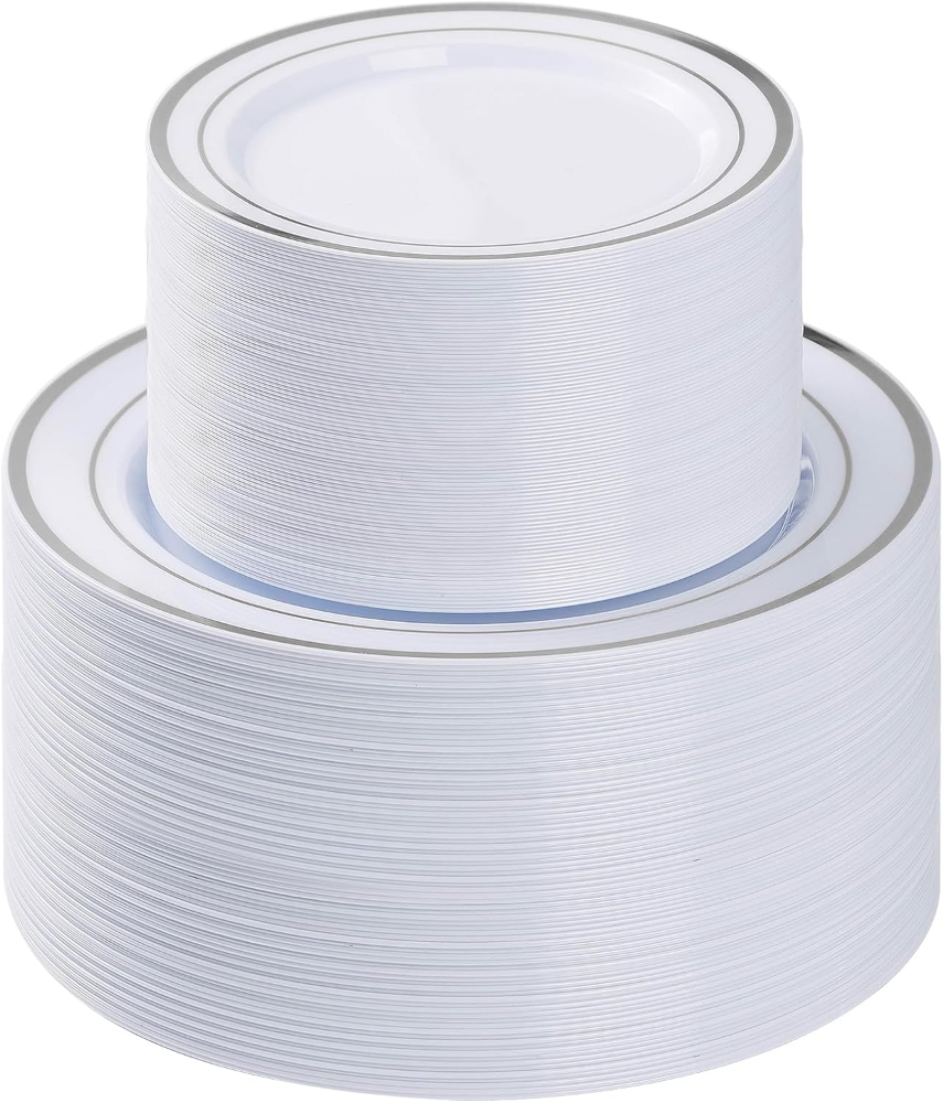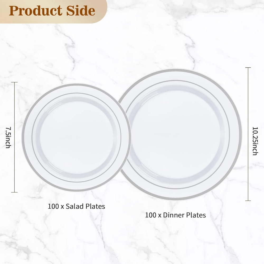 BESTVIP 200 platos de plástico plateados, platos desechables para fiestas con 100 platos llanos y 100 platos de postre