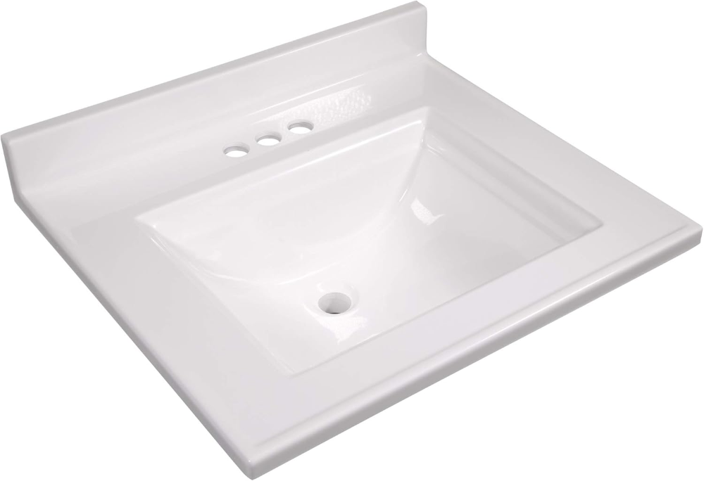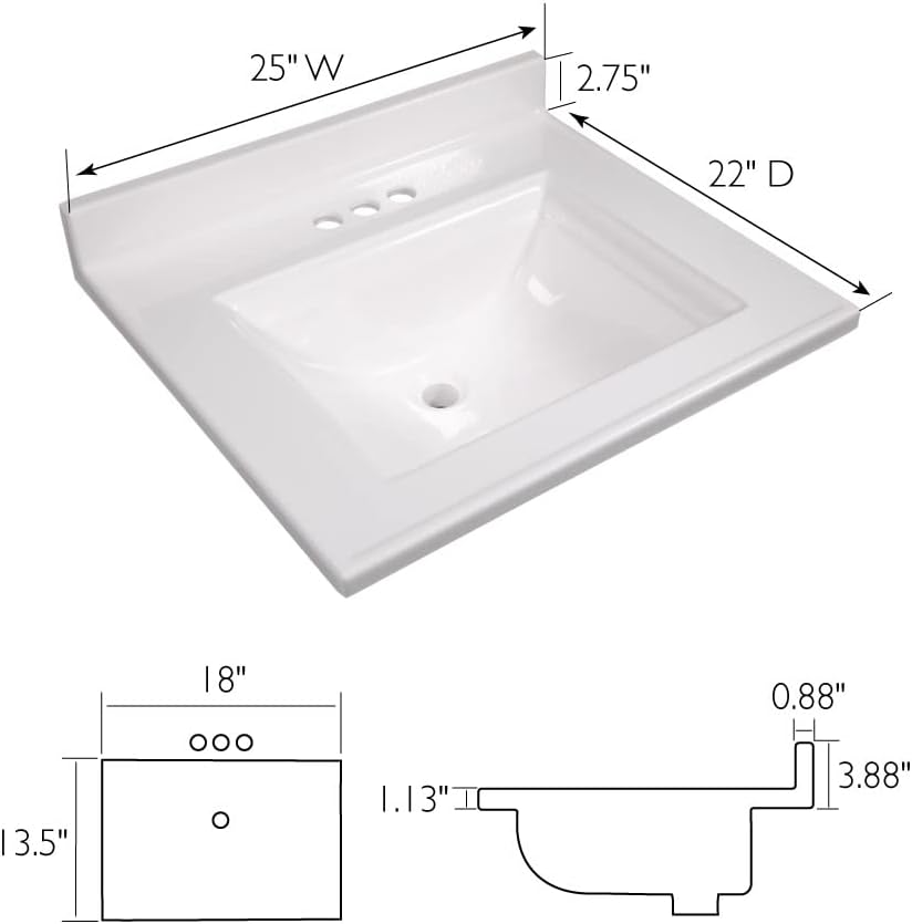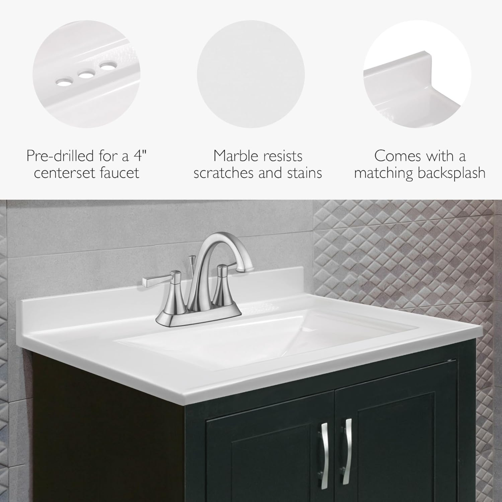 Encimera de tocador Design House Camilla modelo 557629-WHT, fabricada en mármol cultivado de alta calidad, ideal para baños residenciales o comerciales. Su superficie es resistente a manchas, duradera y fácil de limpiar, ofreciendo una apariencia limpia y moderna en color blanco. Incorpora un cuenco rectangular integrado con montaje central, diseñado para un uso cómodo y una estética ordenada. Cuenta con protector contra salpicaduras integrado que ayuda a mantener la pared protegida del agua. Su diseño permite una instalación sencilla sobre muebles de tocador compatibles, siendo una excelente opción para remodelaciones o proyectos nuevos que buscan funcionalidad, resistencia y un acabado elegante.