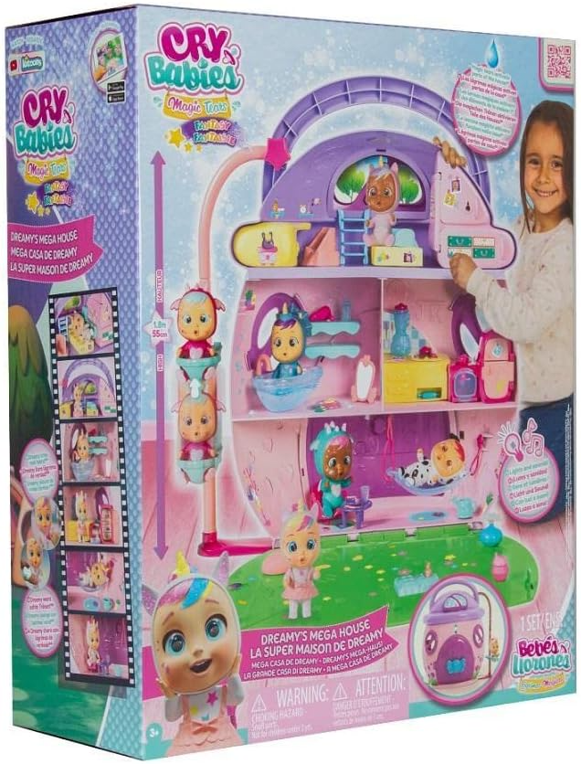 Cry Babies Magic Tears La Mega Casa de Dreamy es un espectacular set de juego de 3 pisos con luces, sonidos y más de 25 accesorios para vivir historias mágicas. Incluye una muñeca exclusiva de Dreamy y espacios totalmente amueblados: dormitorio, baño, cocina equipada, sala y zona exterior. Los niños pueden activar efectos especiales con las lágrimas mágicas de Dreamy: revelar imágenes en el espejo, encender luces y sonidos en el horno o cambiar el color de la flor. Además, cuenta con ascensor funcional y detalles coloridos que estimulan la imaginación. Ideal para niñas y niños de 3 a 10 años, es el regalo perfecto para recrear el universo Cry Babies Magic Tears en casa.