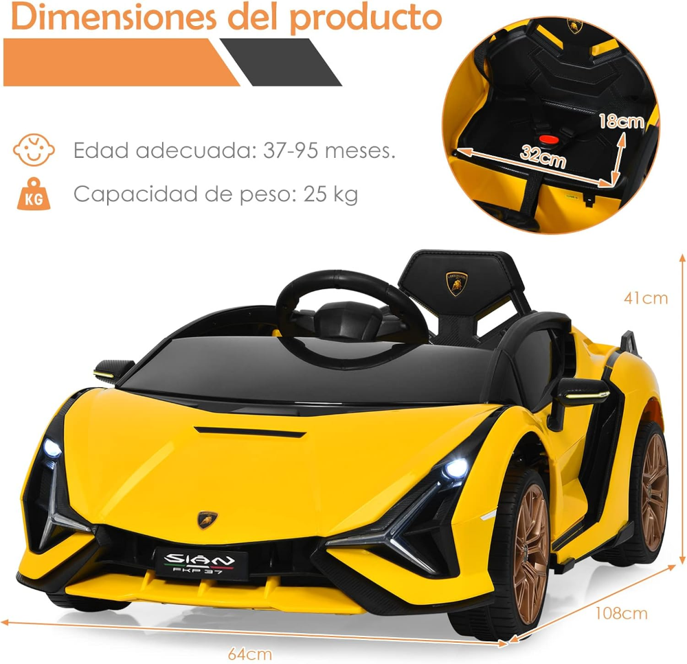 Coche montable COSTWAY Lamborghini 12V con control 2.4G, luces LED, música MP3, bocina, puertas y suspensión; seguro y divertido. VALORADO