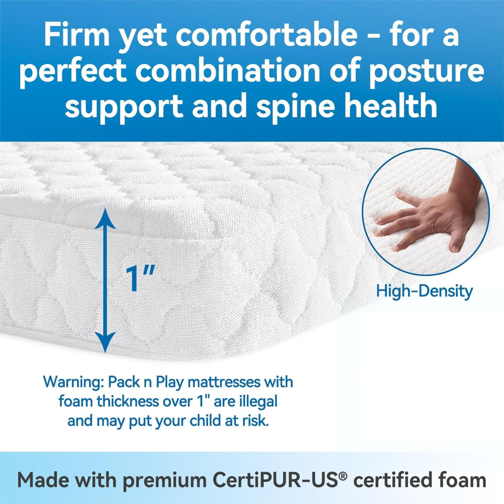 El colchón Pro Goleem Pack and Play (modelo Y10) ofrece confort, seguridad y portabilidad para el descanso de bebés y niños pequeños. Diseñado con espuma de alta densidad y una funda impermeable hipoalergénica, proporciona una superficie firme y cómoda que promueve un sueño seguro. Su tamaño universal de 38 x 26 pulgadas se adapta perfectamente a la mayoría de los corrales o cunas tipo Pack n Play, con esquinas redondeadas que evitan huecos peligrosos.