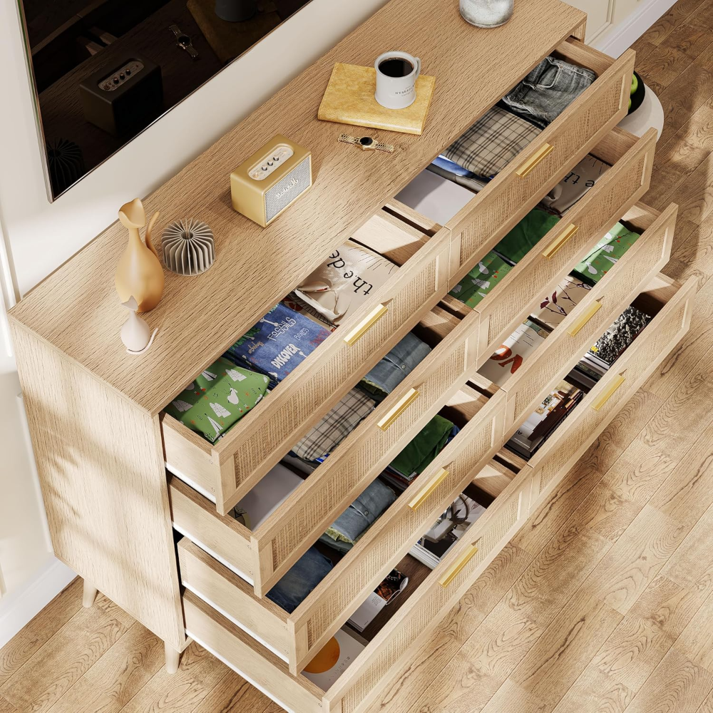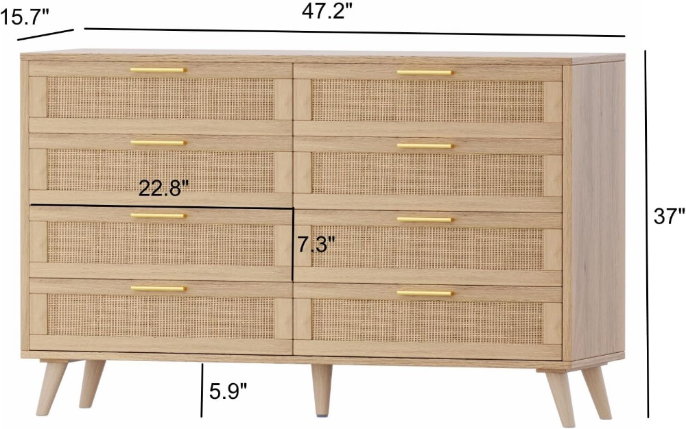Cómoda doble de 8 cajones para dormitorio, cómoda de ratán, cómoda de madera moderna con asas doradas, mesa auxiliar para armario, sala de estar y entrada, color madera natural *VALORADO*