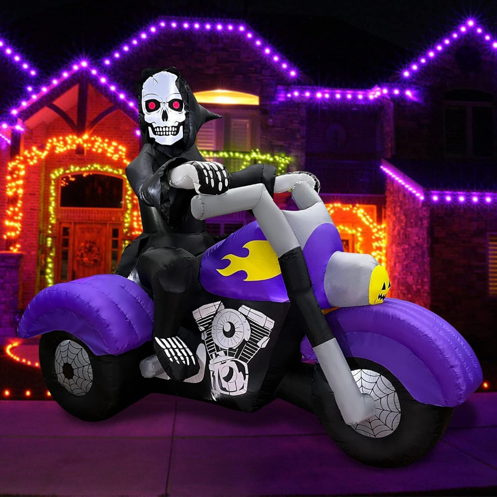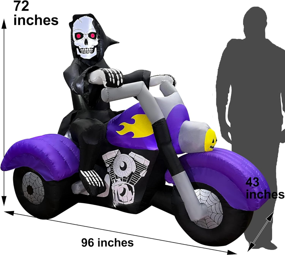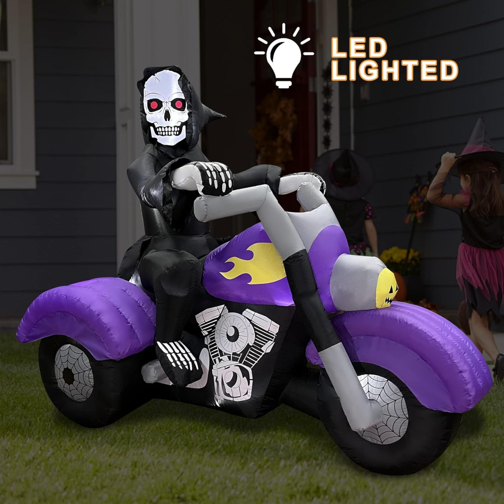 Transforma tu jardín en una escena de Halloween inolvidable con la decoración inflable de BLOWOUT FUN. Este impresionante esqueleto de la Parca de 2.4 metros de largo, montado en una motocicleta, crea una atmósfera espeluznante que dejará a todos tus vecinos asombrados.