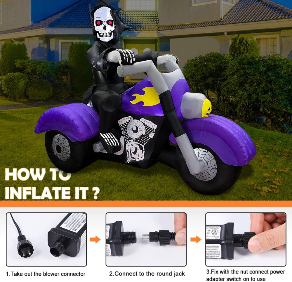 Diseño espectacular: Con un esqueleto de la Parca en una moto, este inflable se convierte en la pieza central perfecta para tu decoración de Halloween, atrayendo la atención y creando un ambiente memorable en tu vecindario.