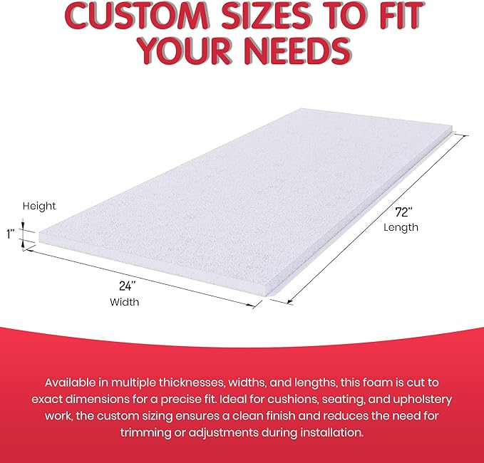 Espuma de alta densidad de 1 pulgada de espesor, 24 pulgadas de ancho, 72 pulgadas de largo, espuma para repuesto de cojín