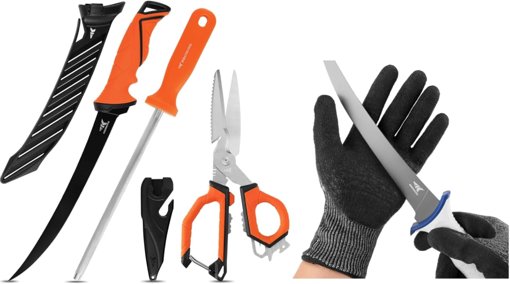 El cuchillo de filete cuenta con hoja flexible de acero inoxidable, ideal para realizar cortes limpios y precisos. Las tijeras multiusos permiten cortar espinas, abrir peces y realizar tareas generales de preparación. La caña de afilar ayuda a mantener el filo óptimo del cuchillo, prolongando su vida útil. Los guantes de seguridad brindan protección adicional durante el manejo de herramientas afiladas.