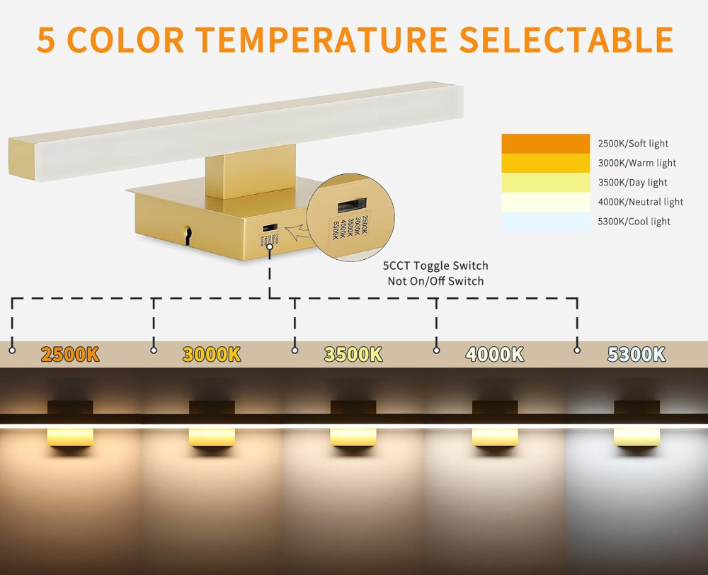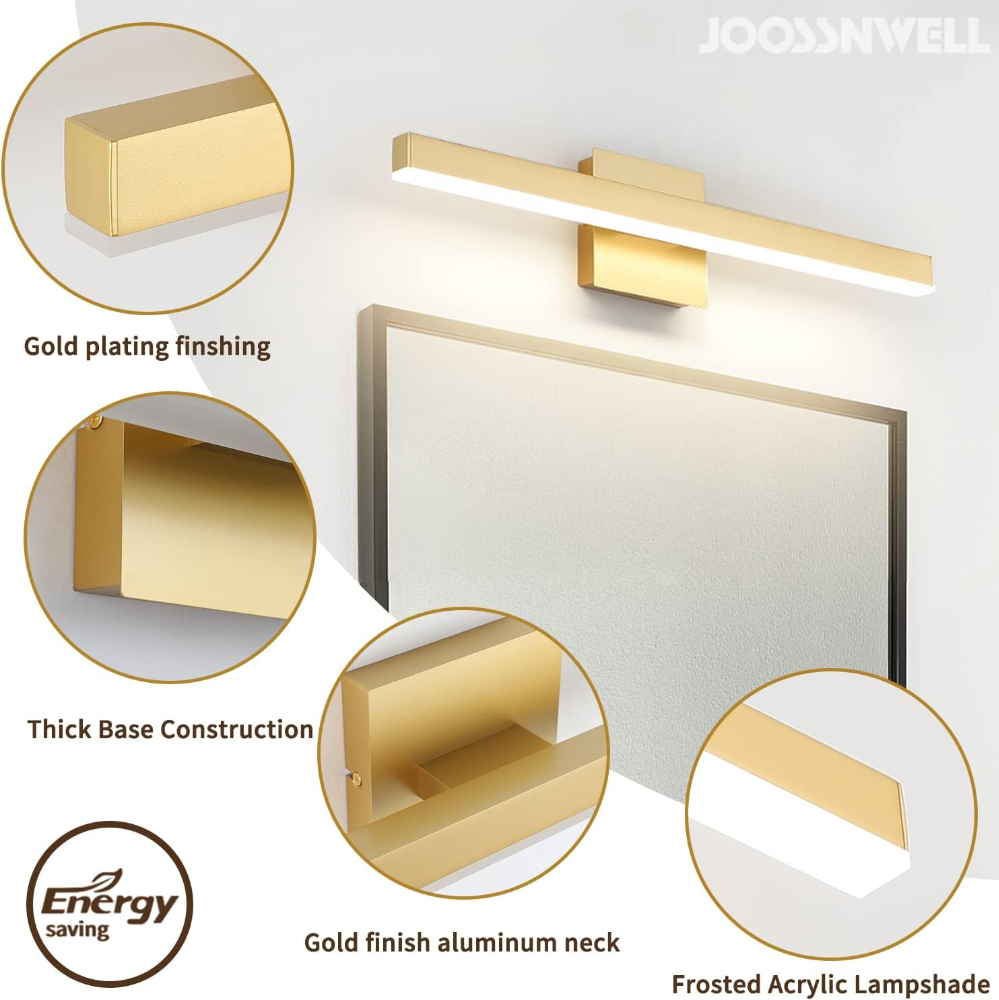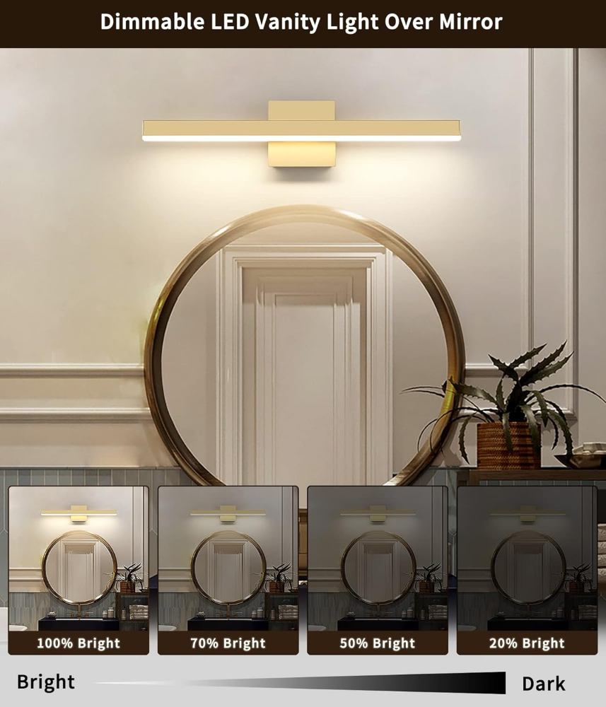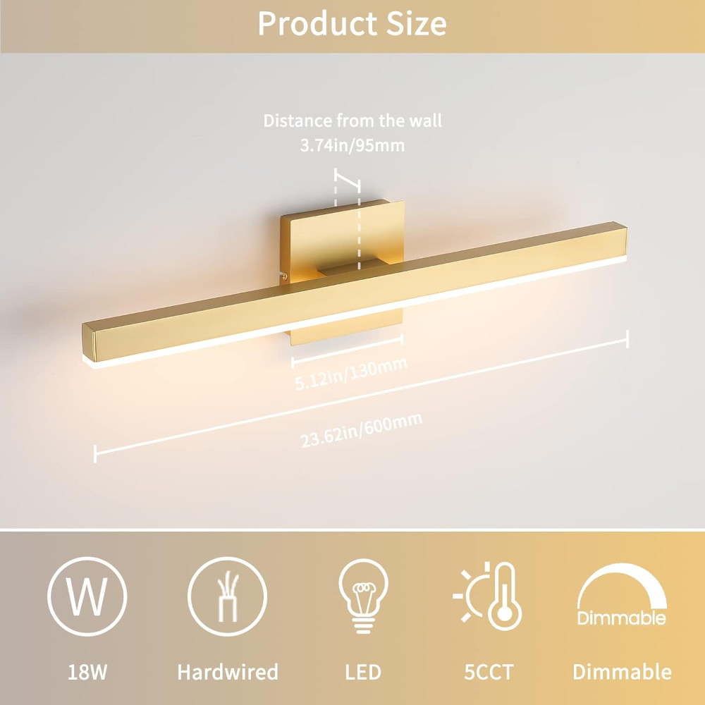 Joossnwell Luces de tocador doradas para baño, 24 pulgadas, regulables, 5CCT, modernas, accesorios de iluminación para tocador de baño, sobre espejo, apliques de pared LED para baño, luz de 18 W