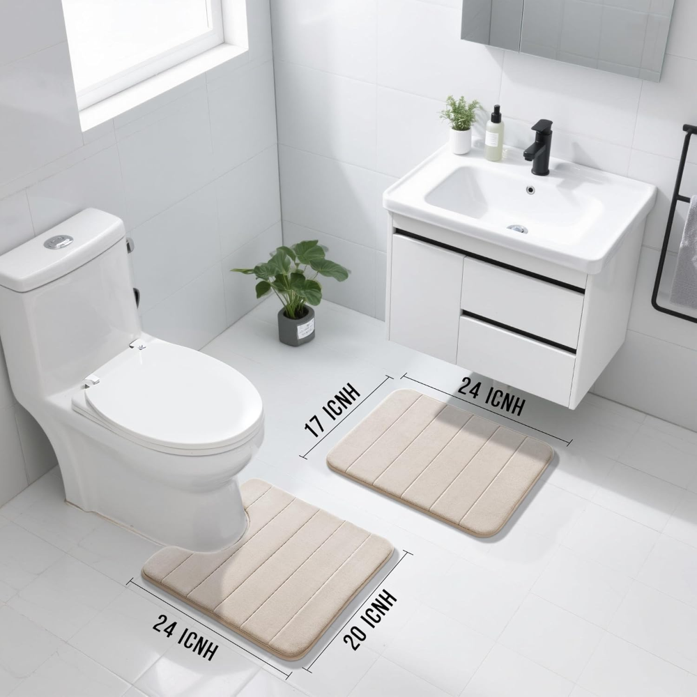 Juego de 2 alfombras de baño de espuma viscoelástica, en forma de U para inodoro, absorción de agua, antideslizantes, gruesas, secado rápido para baño, 17 x 24 y 24 x 20.4 pulgadas, beige