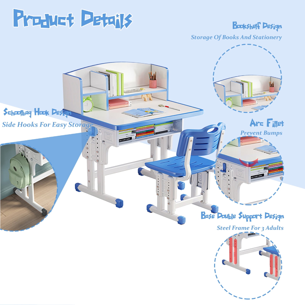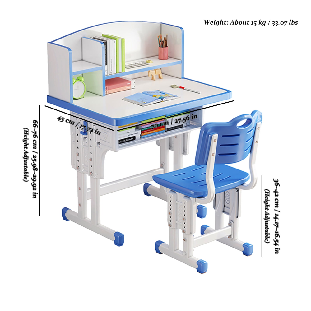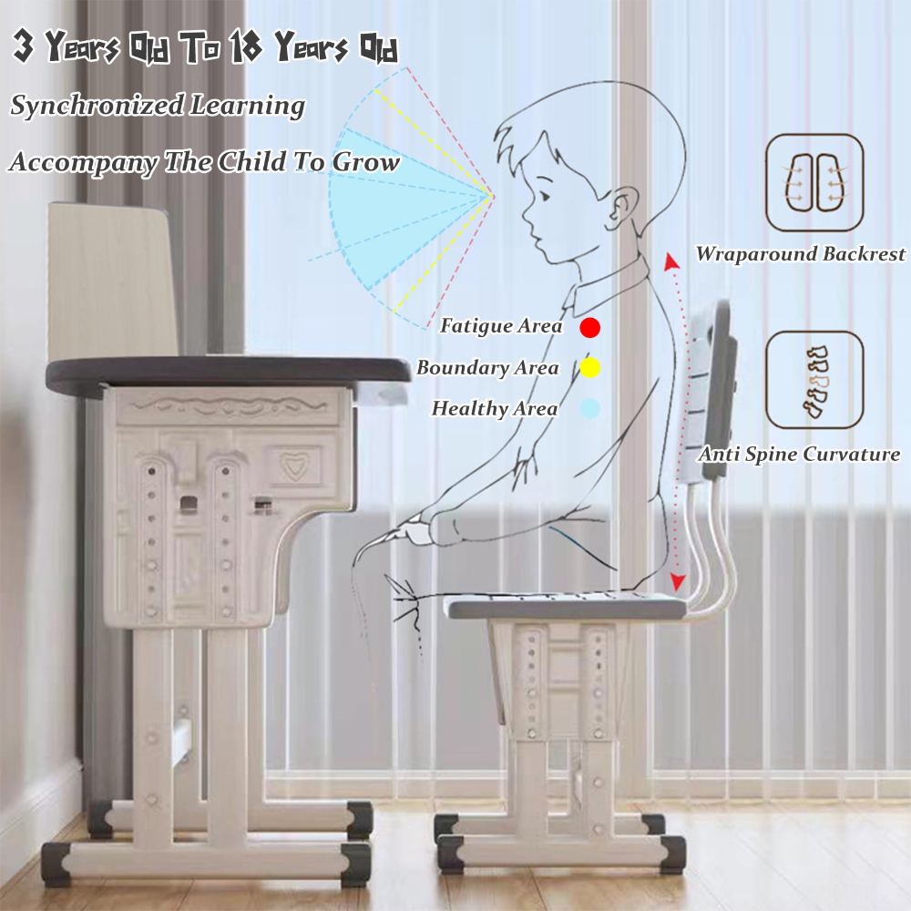 Este juego de mesa y silla está diseñado ergonómicamente para proporcionar un espacio de estudio cómodo y funcional para niños en crecimiento. Es adecuado para una amplia gama de edades gracias a sus características de ajuste.