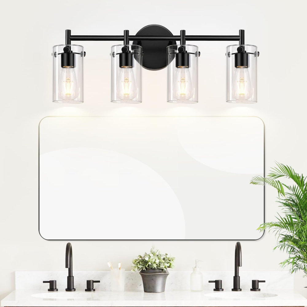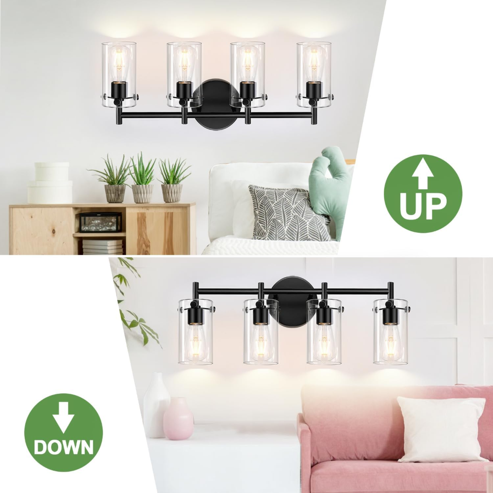Lámparas de baño, 4 luces negras mate, luces de baño negras sobre espejo con pantalla de vidrio transparente, apliques de pared de baño para espejo, dormitorio, sala de estar, pasillo