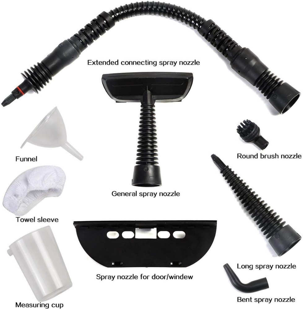 Componentes incluidos: taza medidora, embudo, boquillas de chorro y doblada, cepillo redondo de nylon, paño de toalla, herramienta de limpieza de ventanas