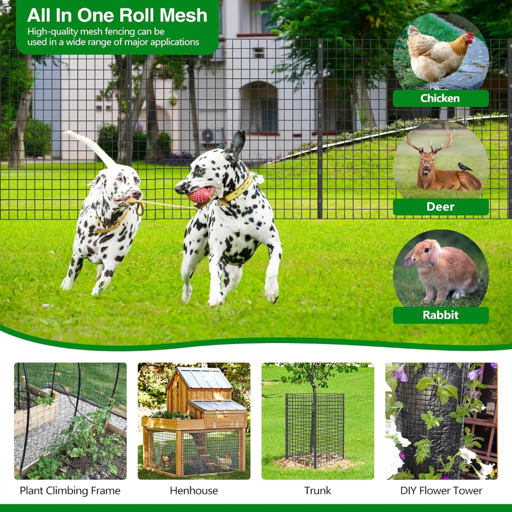 Valla de alambre soldado GILPWA de 48 pulgadas de alto por 50 pies de largo, diseñada para la protección de jardines, cultivos, plantas, aves de corral y áreas agrícolas o residenciales. Su estructura de malla rígida con cuadros de 2 x 2 pulgadas permite una barrera efectiva contra animales como ciervos, perros, conejos y otras especies, sin obstruir la visibilidad.