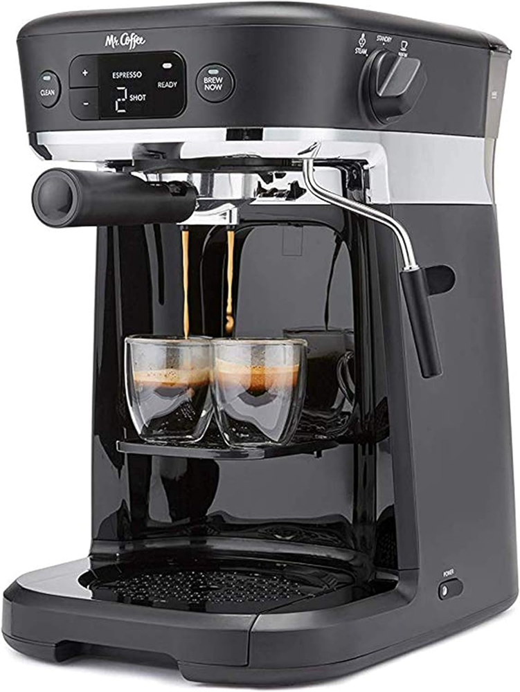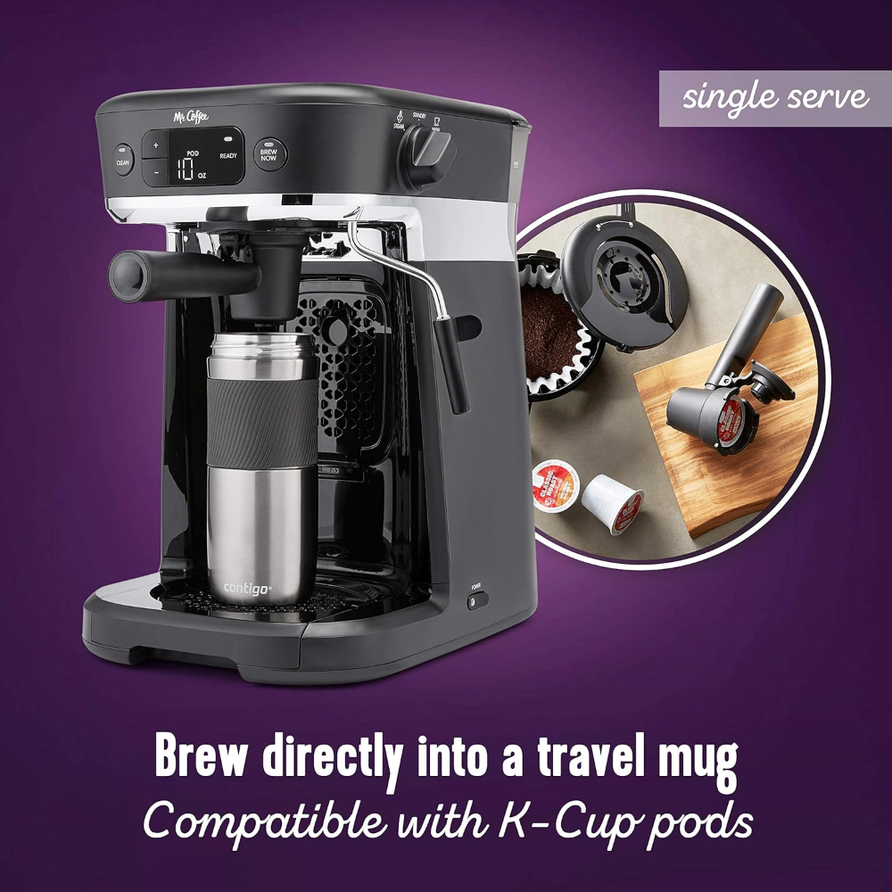 Mr. Coffee Cafetera de cápsulas especiales todo en uno para ocasiones especiales, jarra térmica de 10 tazas y espresso con espumador de leche y bandeja de almacenamiento, color negro