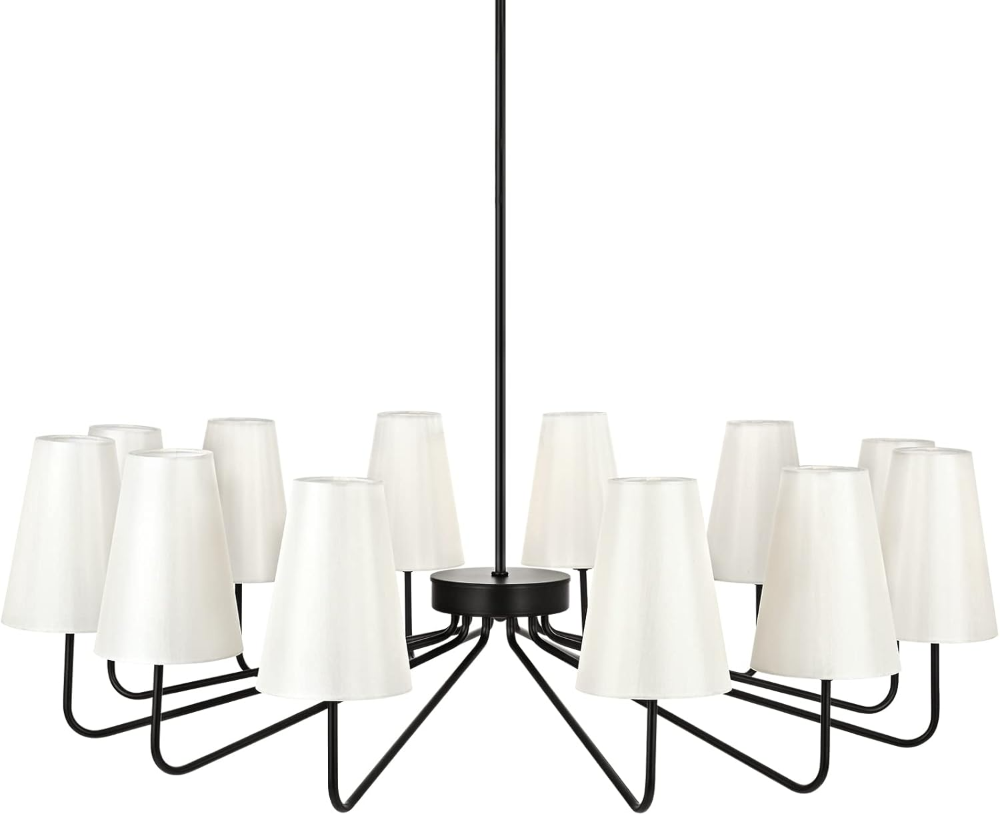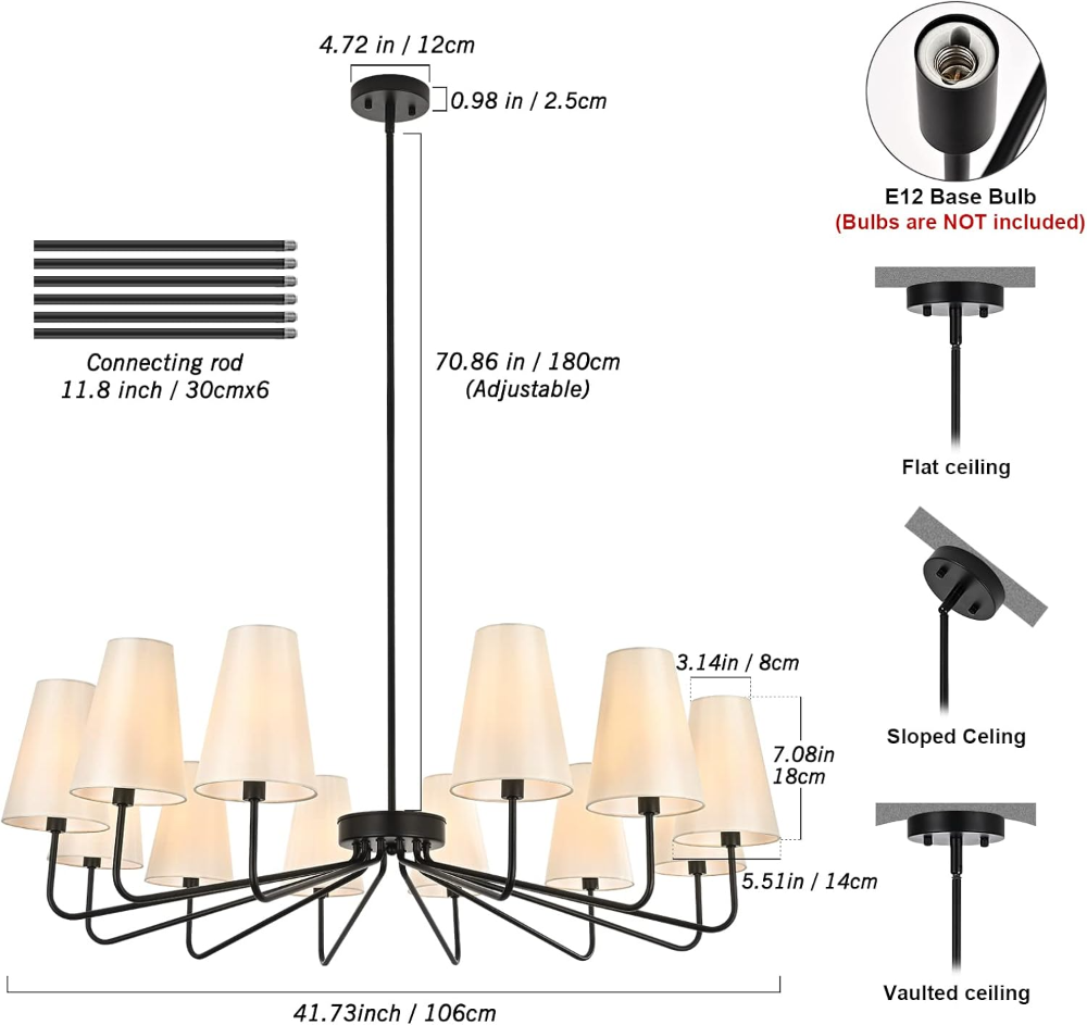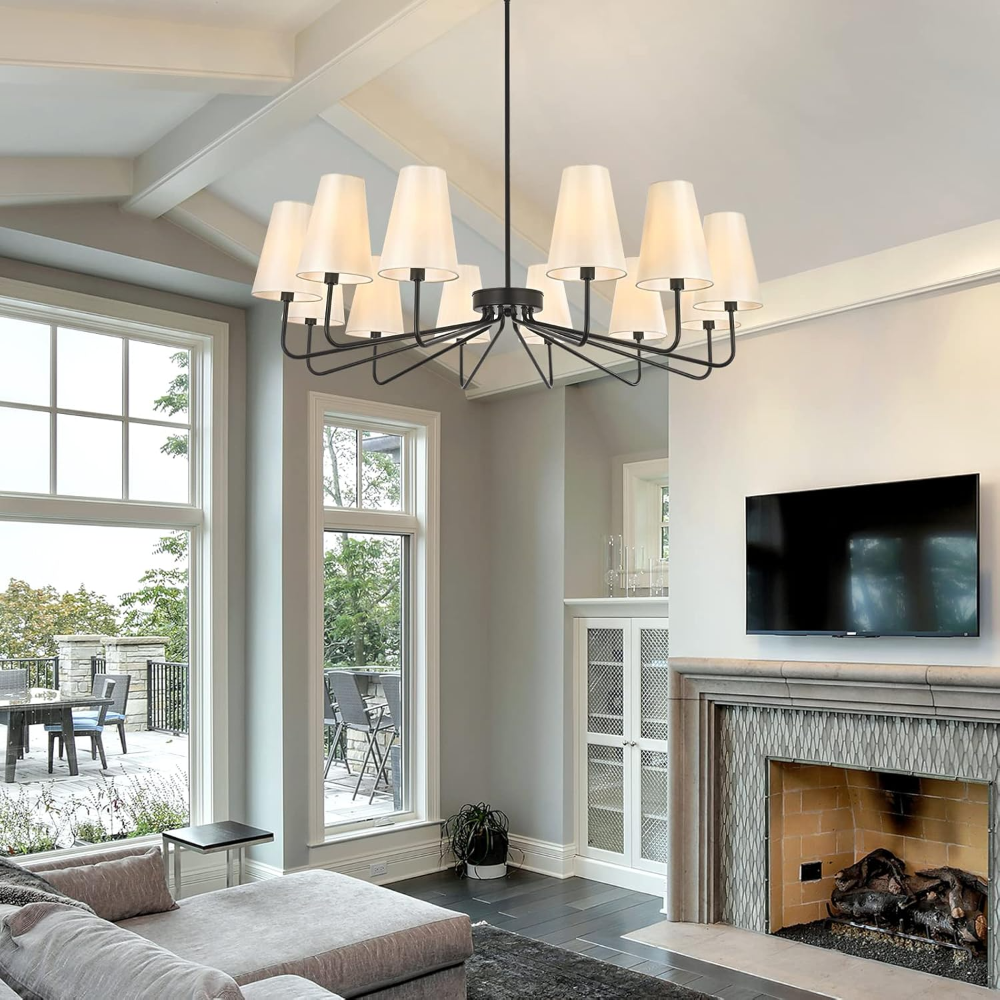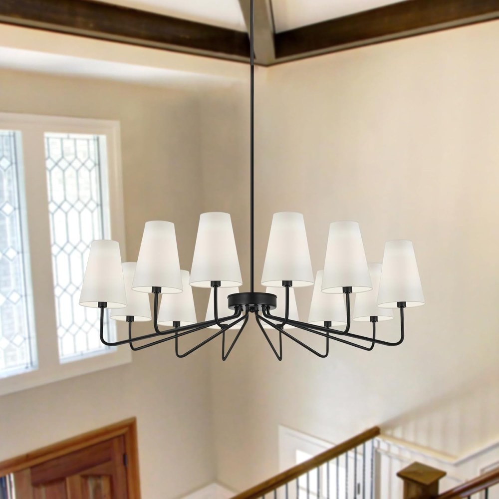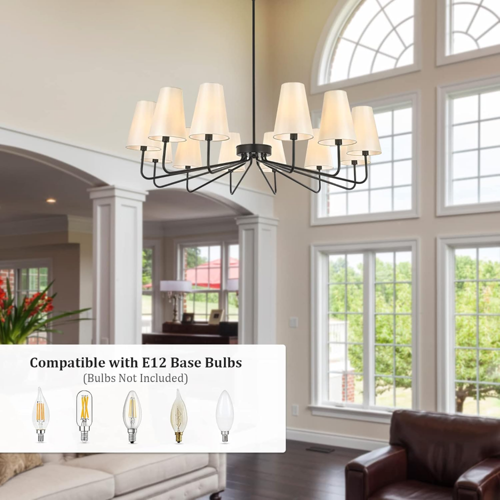 Peblto Candelabros clásicos negros con tela brillante, lámpara colgante de granja de 12 luces, iluminación colgante de techo de 41.75 pulgadas para cocina, recámara, comedor, sala de estar, escalera
