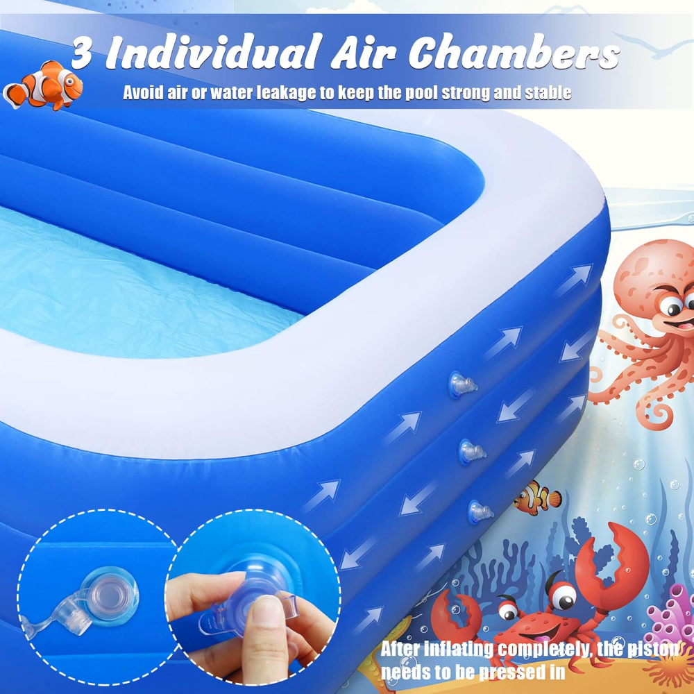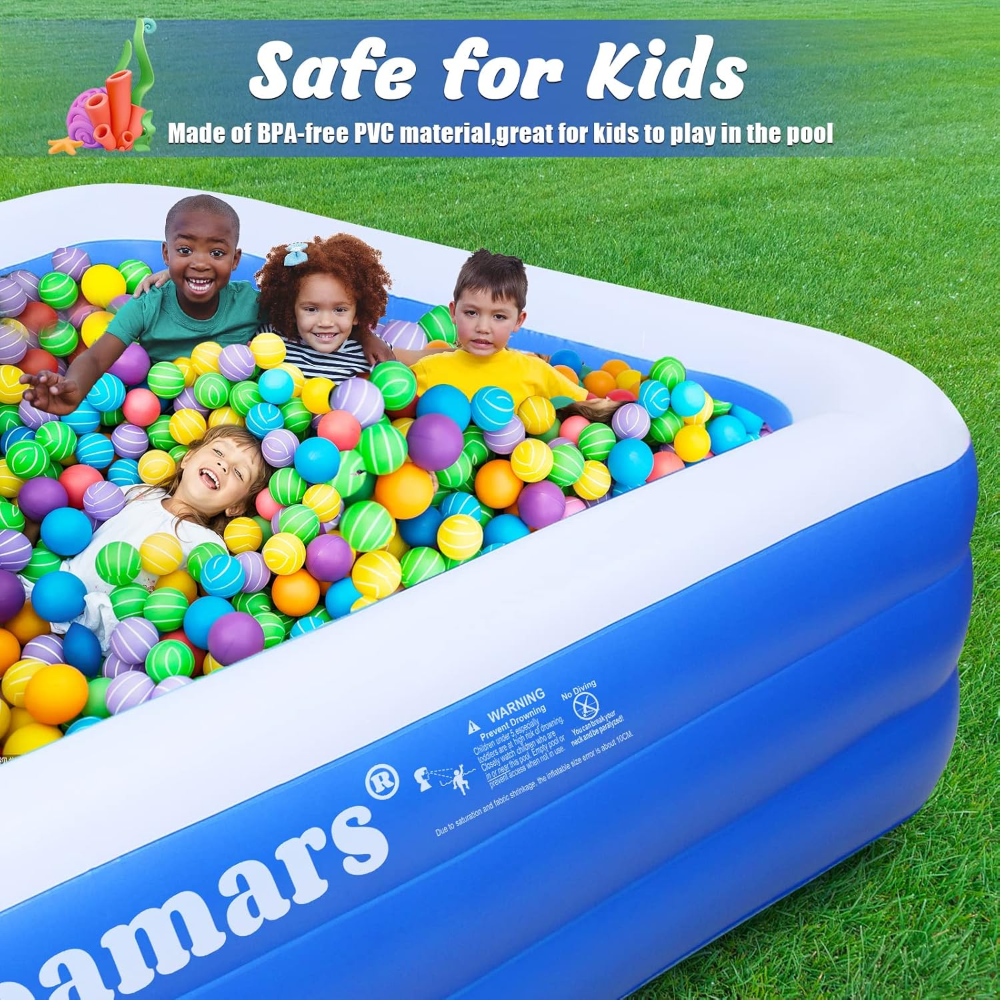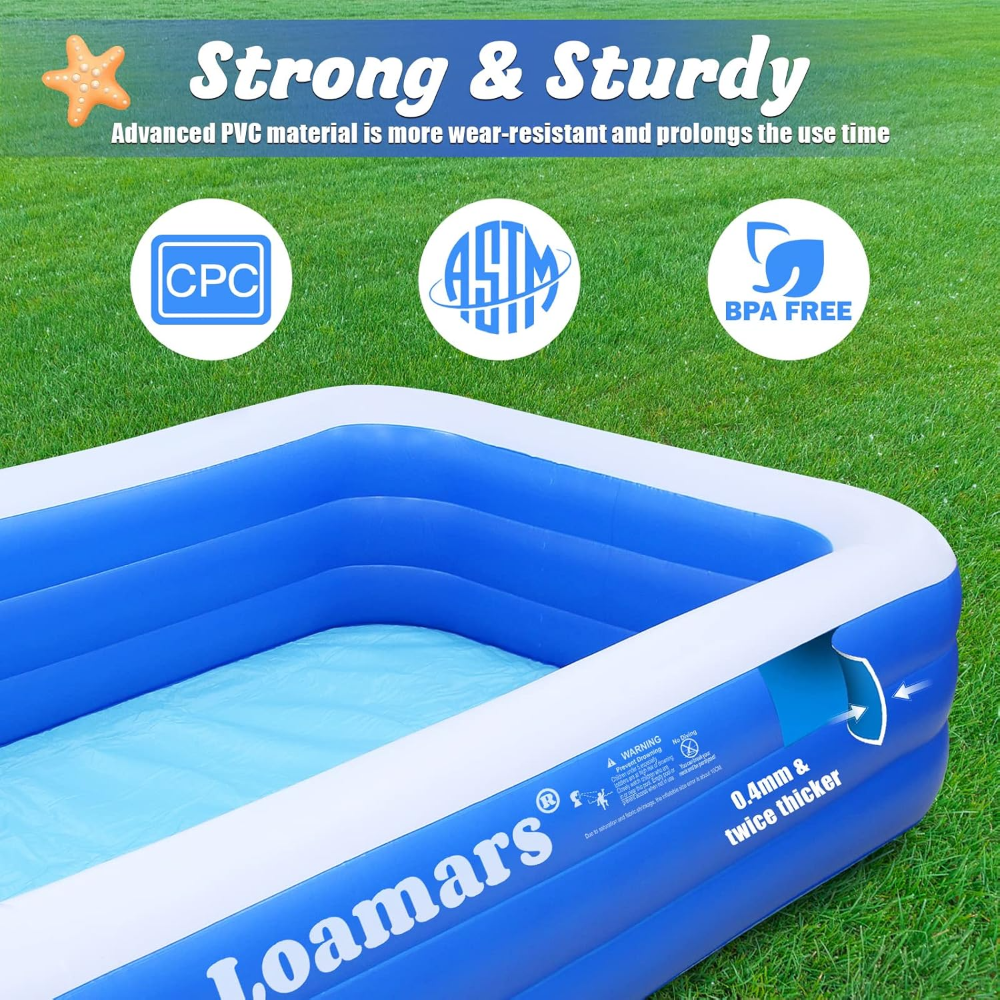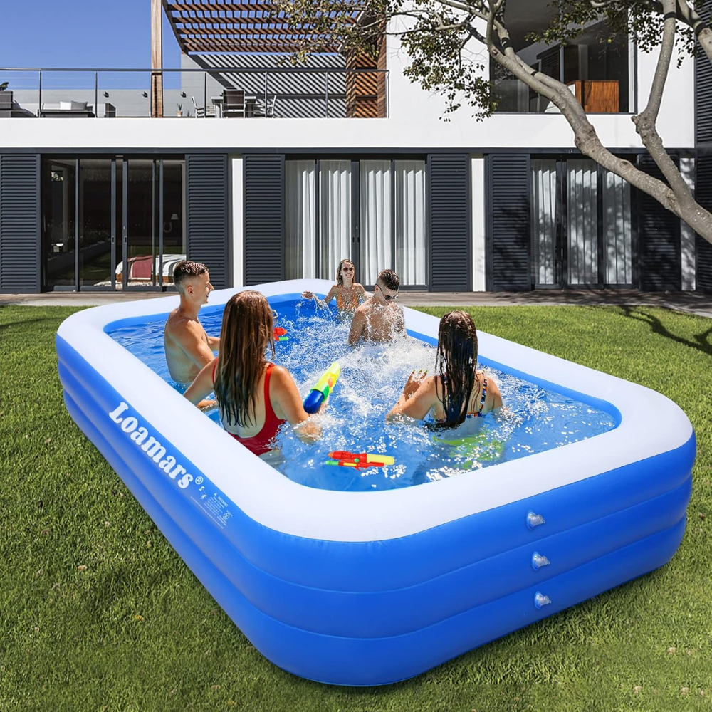 La piscina inflable Loamars es una opción amplia, resistente y cómoda para disfrutar en familia durante el verano. Su diseño rectangular ofrece gran espacio para adultos y niños, mientras que su estructura de PVC de alta resistencia garantiza estabilidad y durabilidad. Cuenta con tres cámaras de aire independientes que mejoran la seguridad y reducen el riesgo de fugas. Su instalación es sencilla: solo se infla, se llena y está lista para usarse en el patio, jardín o terraza. Es ideal para actividades familiares, juegos acuáticos y momentos de relajación al aire libre, proporcionando una capacidad generosa y un uso confiable durante toda la temporada.