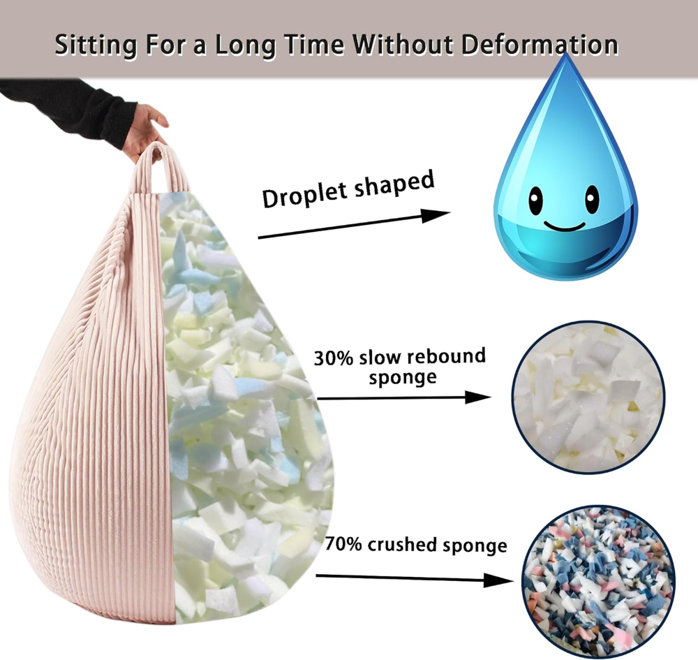 Está relleno con espuma viscoelástica triturada, que ofrece un balance ideal entre suavidad y soporte, manteniendo su forma con el uso. El exterior está confeccionado en tela de corduroy suave, agradable al tacto y resistente para el uso diario. Su diseño sin estructura rígida lo hace seguro para niños y fácil de mover dentro del hogar.
