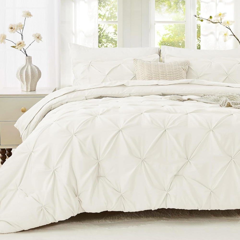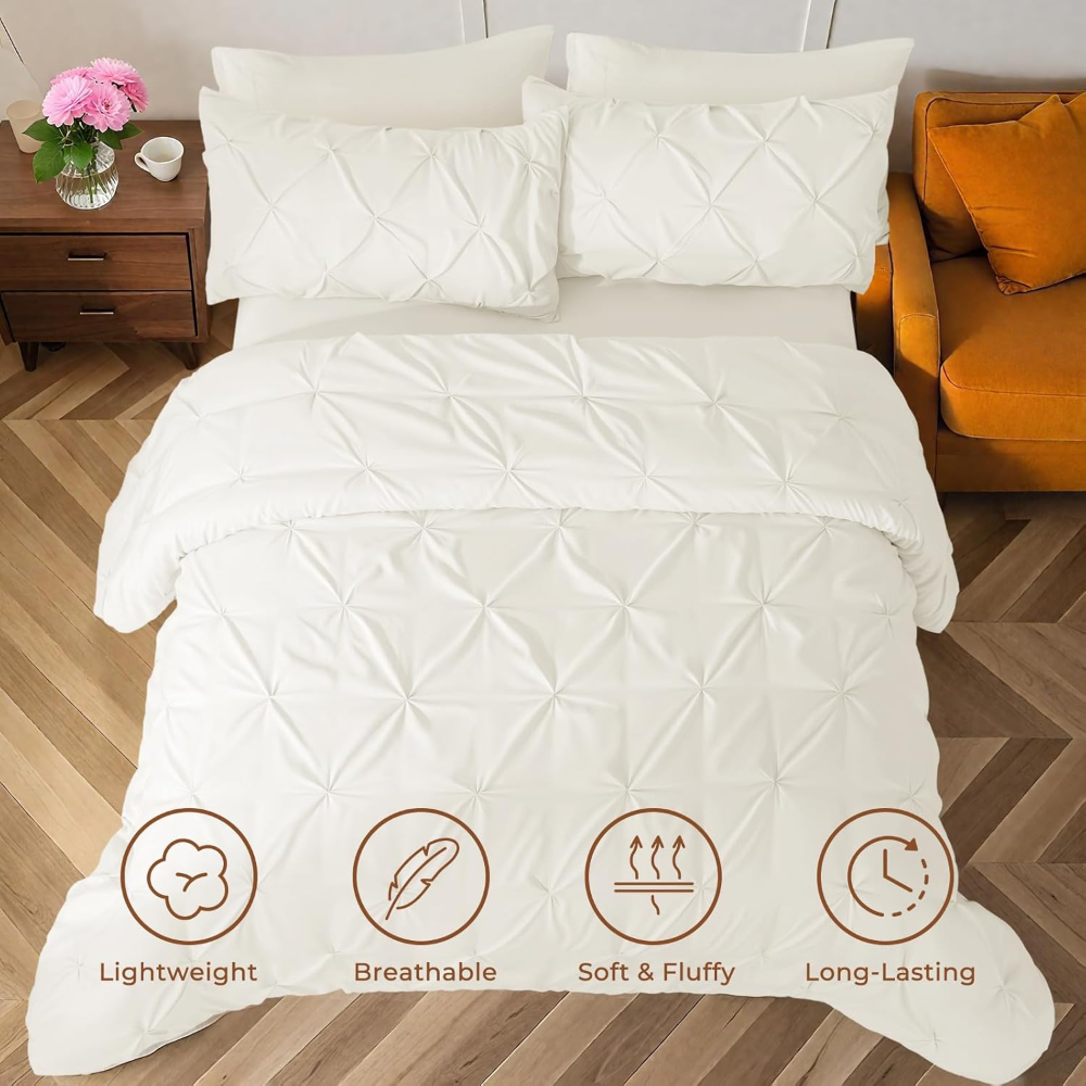 El juego de edredón Sasttie tamaño Queen de 7 piezas está diseñado para brindar confort, elegancia y funcionalidad durante todo el año. Su diseño pin tuck aporta un estilo sofisticado y atemporal que realza la decoración del dormitorio, adaptándose fácilmente a ambientes modernos o clásicos.