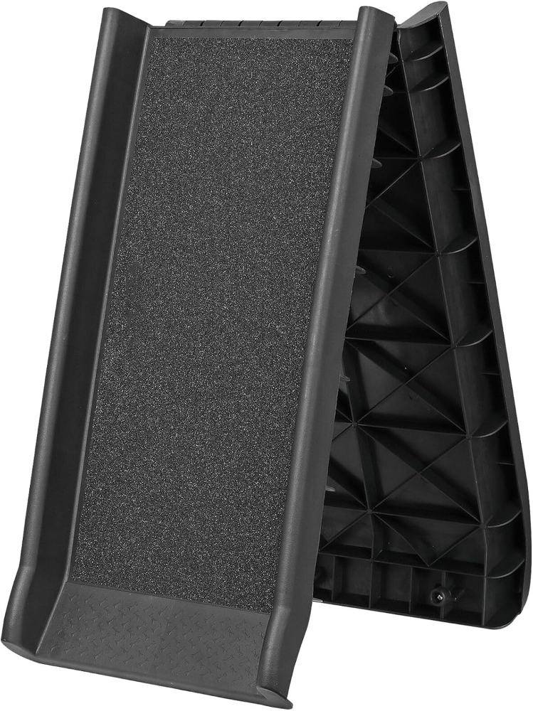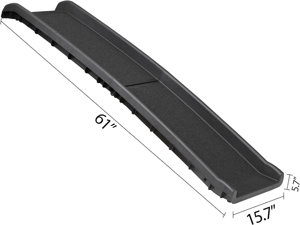 La rampa plegable para mascotas MEZHI está diseñada para ofrecer una subida segura y cómoda a perros de todos los tamaños hacia autos, camionetas, SUV o superficies elevadas. Fabricada en polipropileno de alta resistencia, soporta hasta 200 lb (90 kg) pese a ser una estructura ligera de solo 9 lb (4.1 kg). Su superficie texturizada antideslizante brinda un agarre firme incluso para perros mayores, con sobrepeso o con movilidad reducida. Las pinzas de goma en la base mantienen la rampa estable mientras está en uso, evitando movimientos inesperados. Se pliega por la mitad para guardarse con facilidad y cuenta con un pestillo de seguridad que evita aperturas accidentales. Es una solución práctica, duradera y segura para proteger articulaciones y reducir saltos bruscos al subir a vehículos.