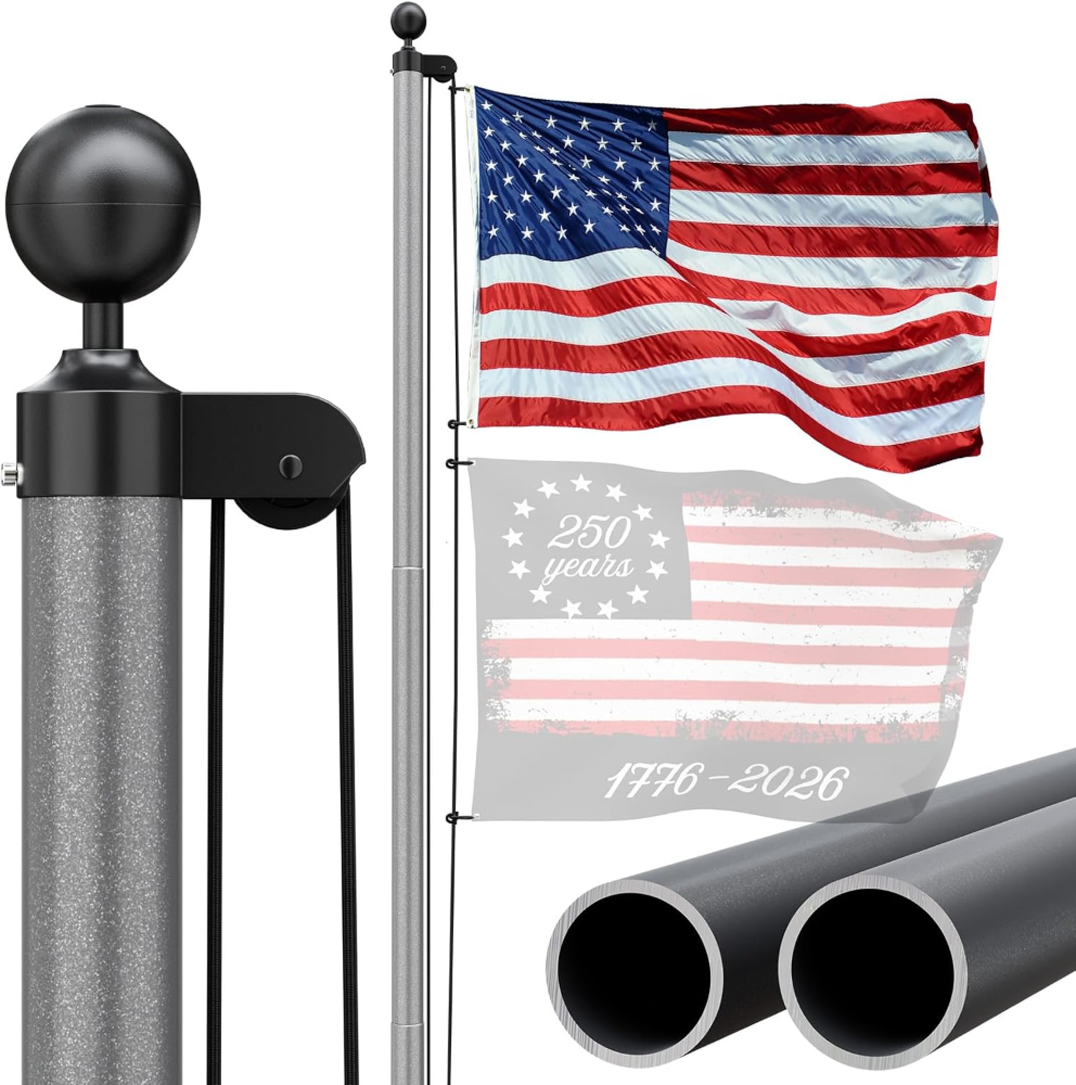 SCWN Mástil de bandera de alta resistencia para el suelo de la casa, kit de asta de bandera de aluminio extra grueso de calibre 13 de 25 pies con bandera bordada de nailon de 5 x 3