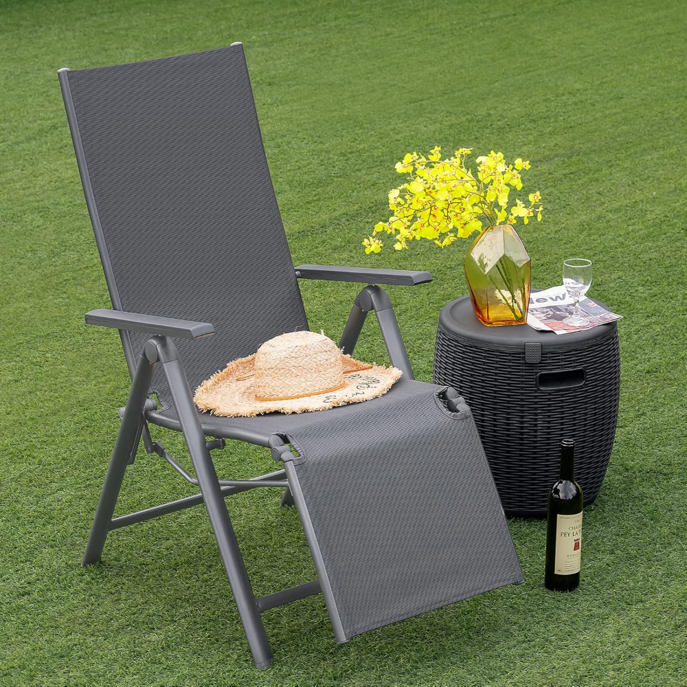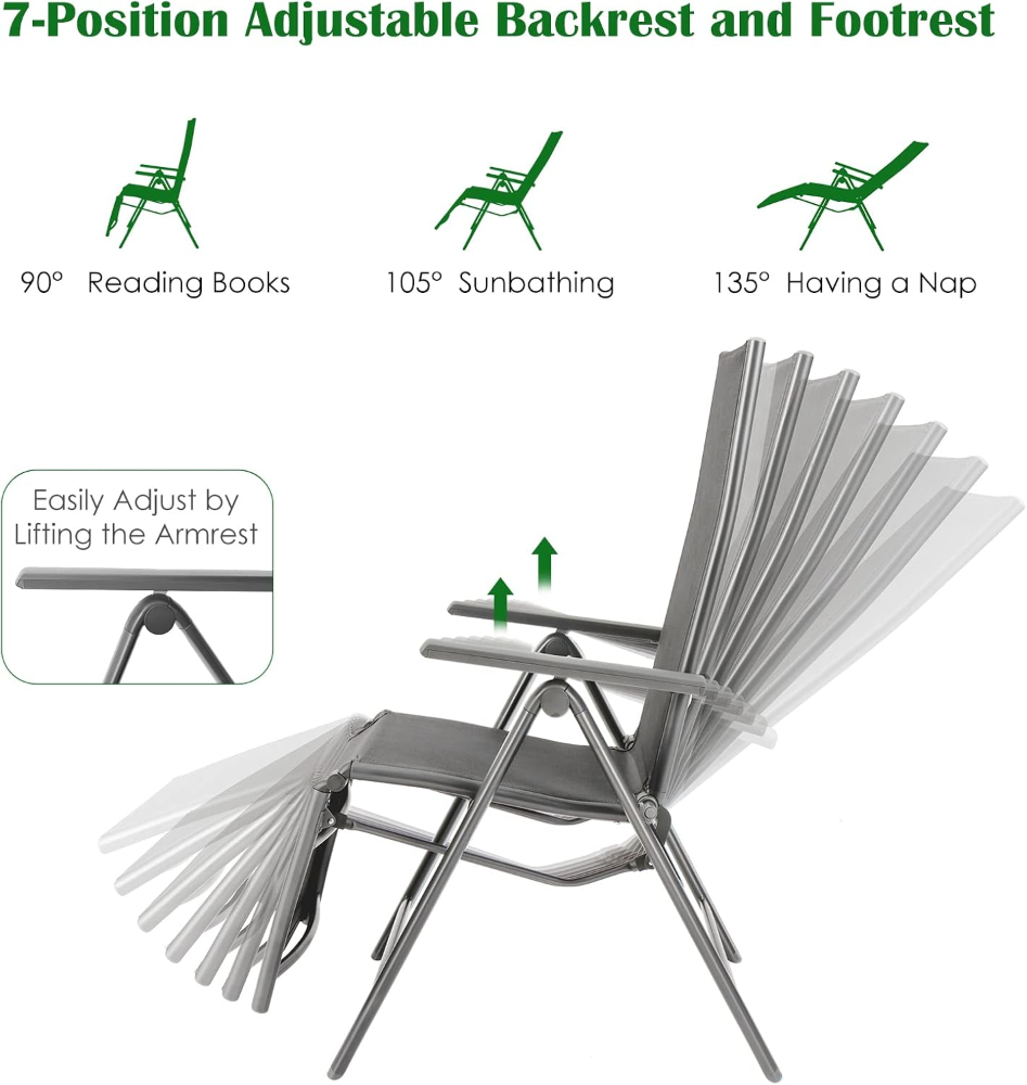 Sillón plegable para exteriores, silla reclinable de patio con 7 posiciones de respaldo y reposapiés ajustables, tumbona portátil con marco de aluminio para piscina, balcón, patio trasero,